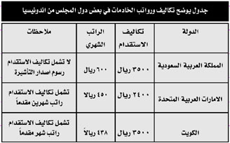 وعلى الرغم من المملكة أكبر سوق للخادمات الاندونيسيات حيث تستقدم المملكة شهرياً ما يقدر بحوالي 15ألف خادمة إلا ان ذلك لم يساهم في تخفيض الأسعار مقارنة مع دول مجلس التعاون التي أسعارها أقل سواء من ناحية تكلفة الاستقدام أو من ناحية مقدار الراتب، حيث تبلغ تكلفة الاستقدام في دولة الامارات العربية المتحدة من الخادمات الاندونيسيات حوالي 2400درهم تشمل على راتب شهرين مقدماً وتكاليف الاستقدام، أما الراتب الشهري فيبلغ حوالي 450درهماً ويقدر حجم سوق الخادمات في الامارات حوالي 30ألف خادمة، أما في دولة الكويت فيبلغ تكلفة الاستقدام من الخادمات الاندونيسيات حوالي 3500ريال ( 280دينار كويتي) يشمل راتب شهر وتكاليف الاستقدام، ويبلغ حجم الراتب الشهري 438ريالاً أي ما يعادل 35دينار كويتي.