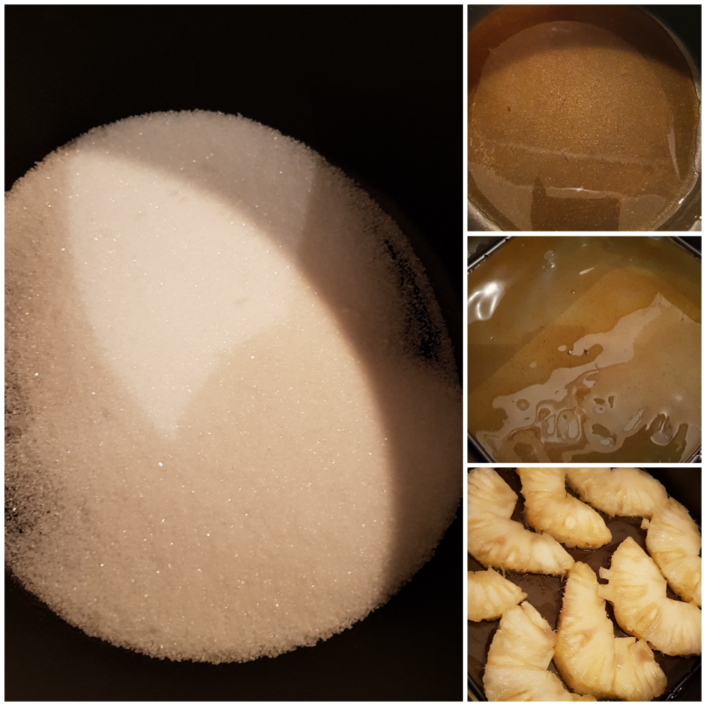 نص كاس سكر مع 3 ملعقة ماء نضعهم في قالب الكيكه وعلى النار حتى يشقر لون الكراميل ويذوب السكر جيدا وبعدها نضع عليهم حلقات الاناناس بشكل مرتب ومنسق لانه راح يكون وجه الكيكه