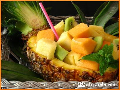 فكي الاناناس قسمين او البطيخ او الحبحب.....قسمين واغرفي فضيها بعدها صبي الفاكهه المقطعه وحطي عليها مصاصه..مزاز