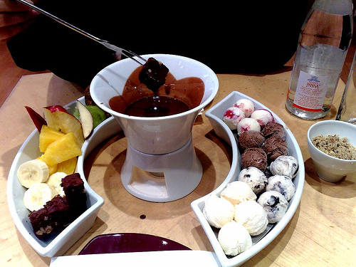 في صحن حلو يقدموا لك قطعة كيك شوكليت مربعة وتكون الكيكة نفسها حااارة يعني توها خارجة من الفرن وعليها دائرة أيس كريم بالتوفي ومزينينها بصوص التوفي والمكسرات