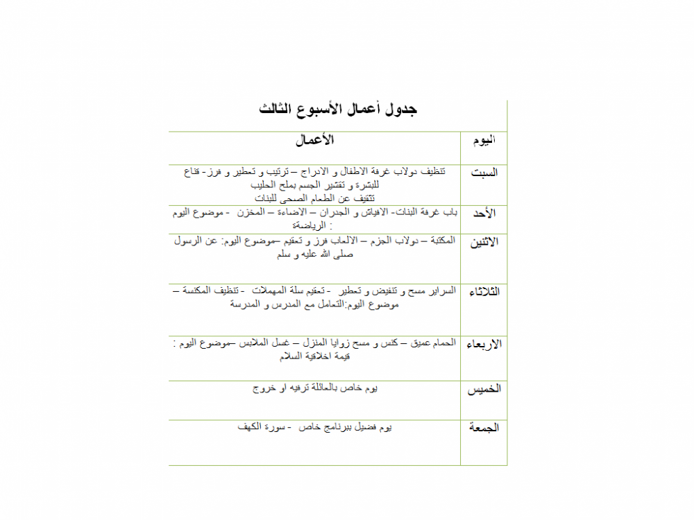 - مساعدة نفسى لأكون*** منظمة*** و اتبع جدول مريح و سهل و نافع و تعديله كل فترة بما يناسب متطلبات حياتى و احتياجاتى .
