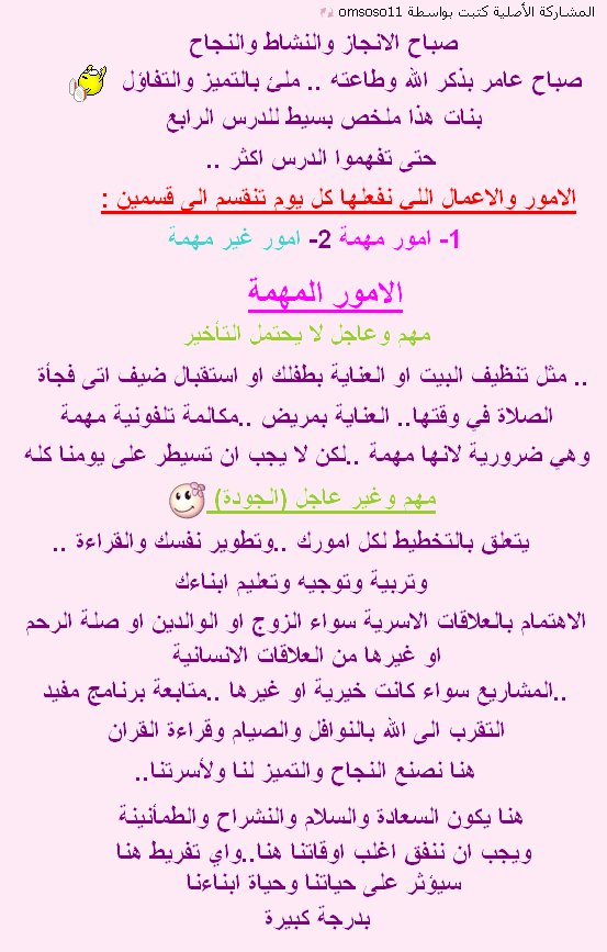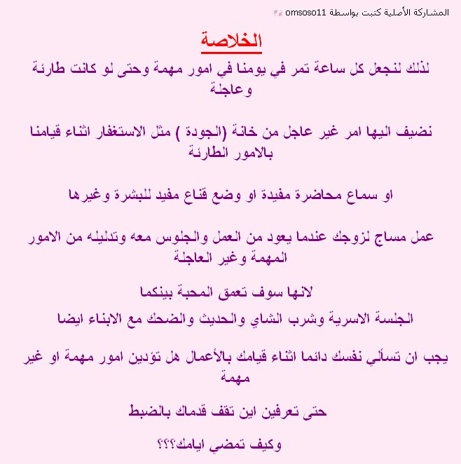 المهمة والعاجلة .. الصلاة وشغل البيت من تنظيف وطبخ وكنس وغسل الملابس ووو... ورعاية ابنائي وواجباتهم وطلبات ابو الشباب(( عااااجلة جدا)).. اتصل حق ابوي كل يوم