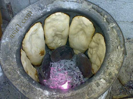 يترك حتى ينضج مع ملاحظة وضع صاج حديد (أو أغطية معدنية) في الأسفل حتى لا يحترق الخبز (الدوح)....