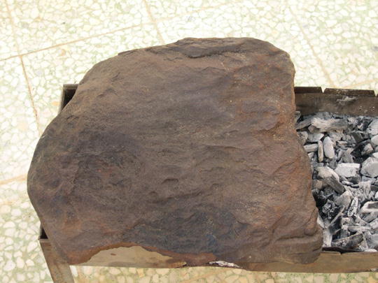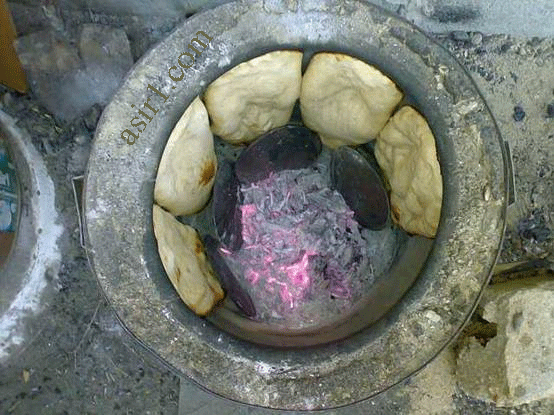 وبعدين يشعلوا الحطب لما يطلع الجمر ,, وتوضع العجينة على حجر يسمونه ؟؟؟