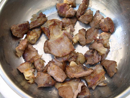 يسلق اللحم بعد غسله بالماء لمدة 5 دقائق ثم يستبدل بماء جديد بحيث يغطي 4/3 القدر مع إضافة