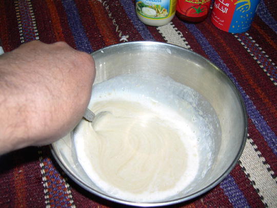 يعجن الدقيق مع الماء زين وتكون العجينة وسط ماهي سائلة ولا قاسية