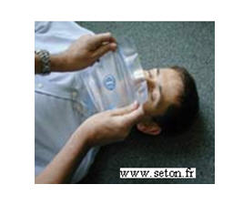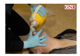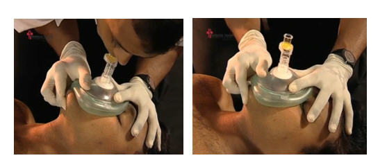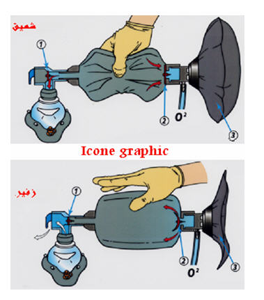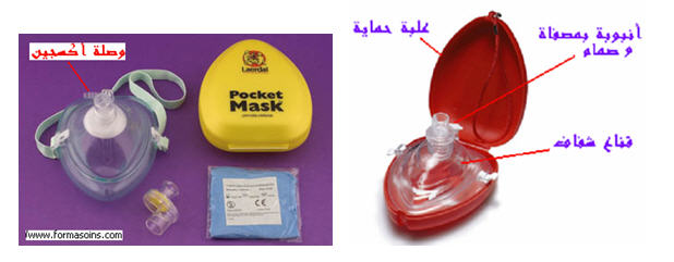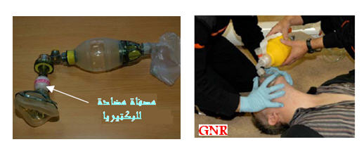 - ضع الجهة الضيقة من القناع على الأنف و الجهة العريضة بين الشفا السفلى و ذقن الضحية على أن يشمل الأنف و الفم معا.