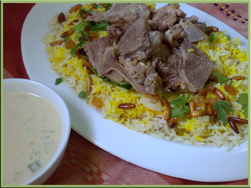*واغلقي القدر فورا واتركيه 10 دقائق ثم ارفعي وضعي علي اللحم وصفي الزبدة او الزيت فوق الرز وقلبيه ..يغـرف في طبق التقديم ووتقدم..