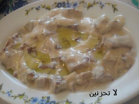 عبارة عن زبادي مع طحينة سايلة وملح وليمون اخلطيهم سوا ثم ضعي الباذنجان عليهم واخلطيهم