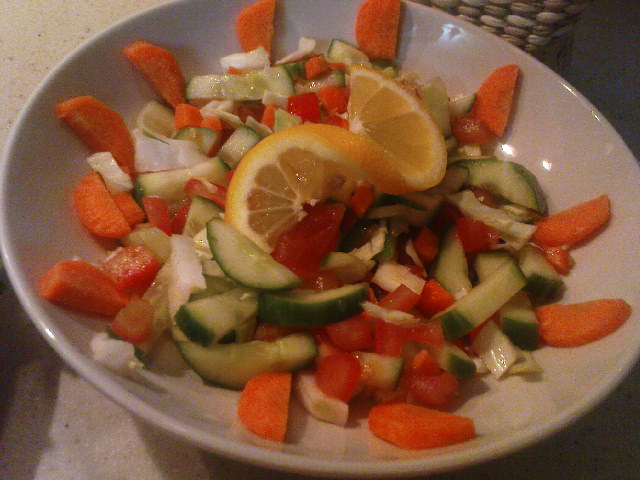 طماطم وخيار وجزر وملفوف ومكرونه مسلوقه