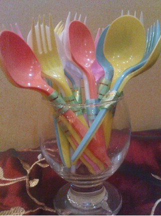 والملاعق والشوك كل ثنتين لفيتهم بشريط والمناديل طبعا والعصير
