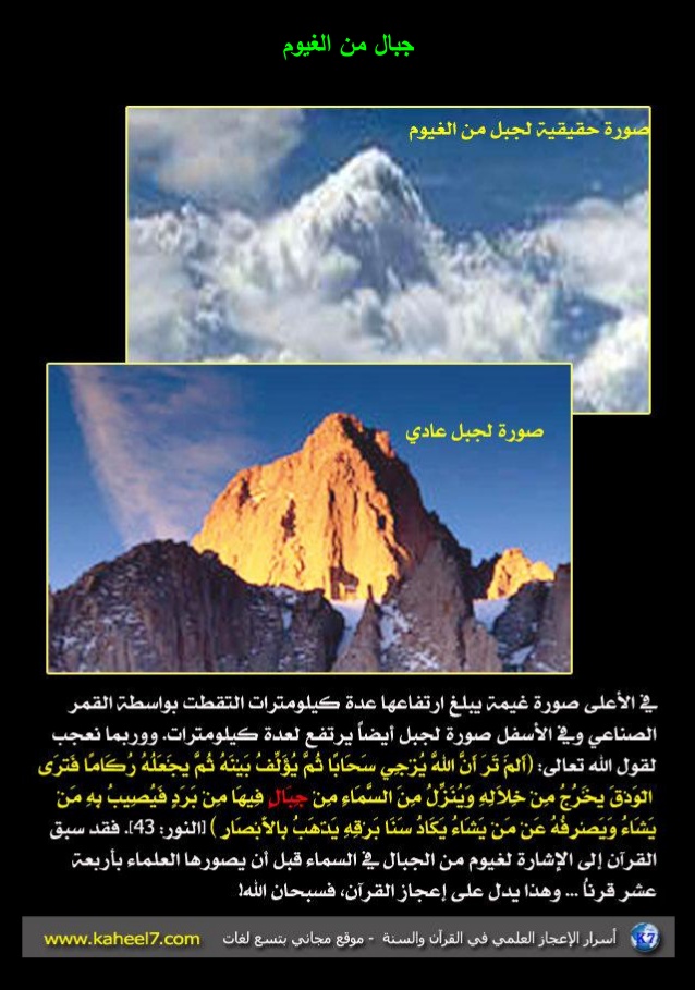 " أَلَمْ تَرَ أَنَّ اللَّهَ يُزْجِي سَحَاباً ثُمَّ يُؤَلِّفُ بَيْنَهُ ثُمَّ يَجْعَلُهُ رُكَاماً فَتَرَى الوَدْقَ يَخْرُجُ مِنْ خِلالِهِوَيُنَزِّلُ مِنَ السَّمَاءِ مِن جِبَالٍ فِيهَا مِن بَرَدٍ فَيُصِيبُ بِهِ مَن يَشَاءُوَيَصْرِفُهُ عَن مَّن يَشَاءُ يَكَادُ سَنَا بَرْقِهِ يَذْهَبُ بِالأَبْصَارِ " (النور:43) .