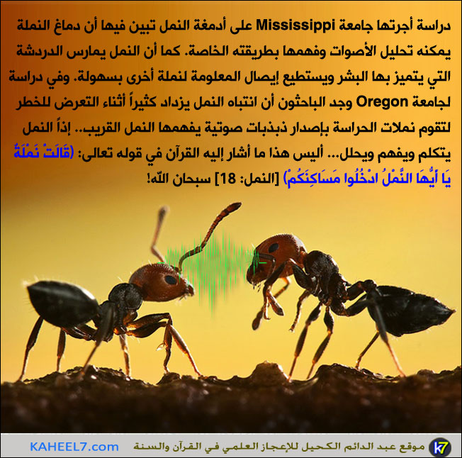 ثانياً: وجود لغة تفاهم بين أفراد النمل :" قَالَتْ نَمْلَةٌ يَا أَيُّهَا النَّمْلُ ادْخُلُوا مَسَاكِنَكُمْ ": فقد اكتشف العلماء أن للنمل لغات تفاهم خاصة بينها