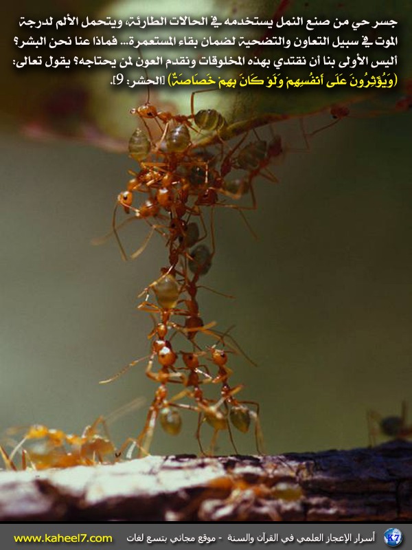 3- تقنية التضحية والإيثار! هل تعلمون أن النمل يضحي بنفسه وحياته من أجل حماية الآخرين وتأمين الراحة والغذاء لهم؟! فالنمل مهندس بارع في صناعة الجسور الحية على الرغم من الألم والتحمل والموت في سبيل بناء المستعمرة.. وسبحان الله، يقول علماء النفس إن التضحية من أهم أسرار النجاح في العمل.