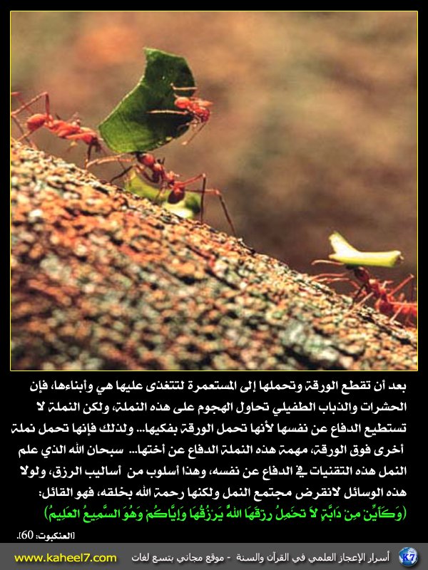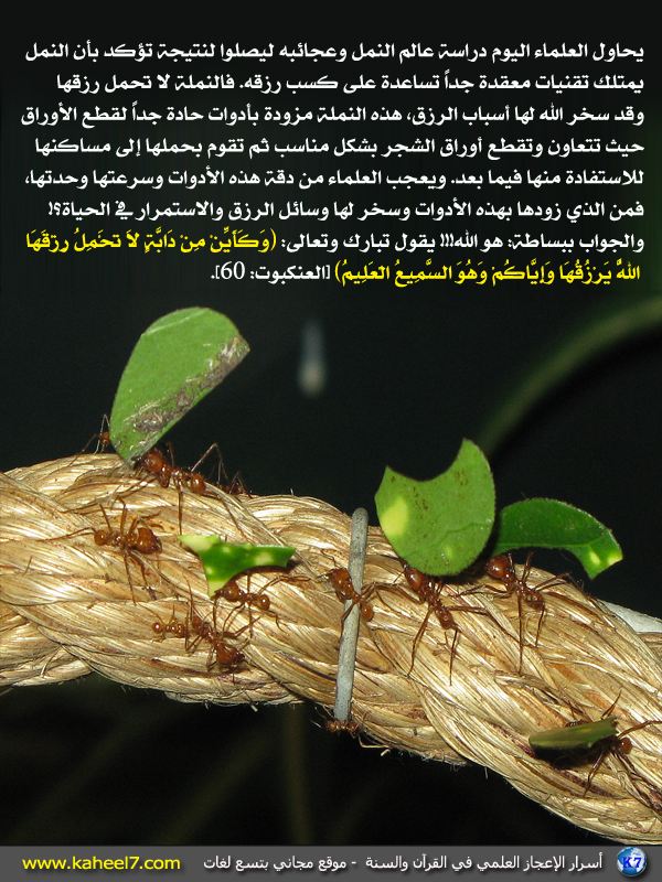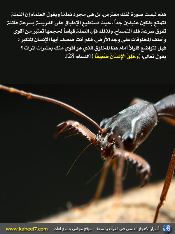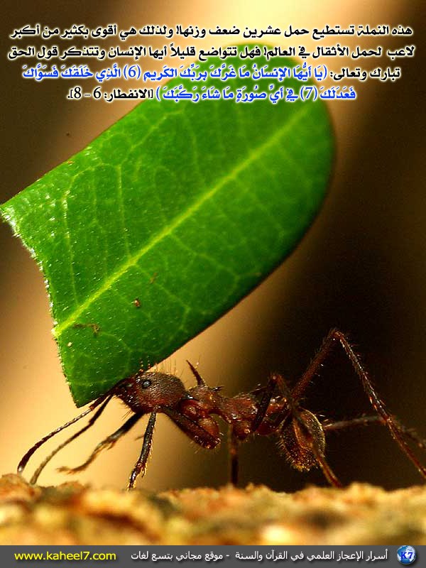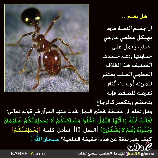 النملة تتحطم! في زمن نزول القرآن لم يكن لأحد قدرة على دراسة تركيب جسم النملة أو معرفة أي معلومات عنه، ولكن وبعد دراسات كثيرة تأكد العلماء أن للنمل هيكل عظمي خارجي صلب جداً يسمى exoskeleton ولذلك فإن النملة لدى تعرضها لأي ضغط فإنها تتحطم، ولذلك قال تعالى على لسان النملة (لَا يَحْطِمَنَّكُمْ سُلَيْمَانُ وَجُنُودُهُ) وبالتالي فإن كلمة (يَحْطِمَنَّكُمْ) دقيقة جداً من الناحية العلمية، فسبحان الله