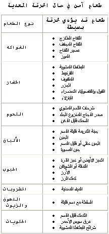 الشوكولا ، الحمضيات ،والعصير ، البندورة ومنتجاتها ، الخردل ، الخلّ ، النعناع ومنتجاته ، والطعام الدسم المقلي المبهّر والمتبّل