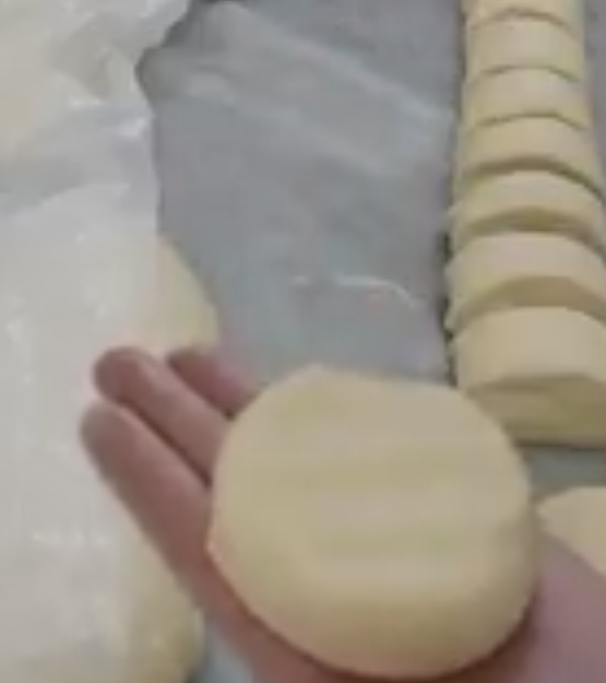 بعد أن يرتاح العجينة أقوم بأخذ رول رول ..أقوم بلفه مرة أخرى على رخام جاف لا يحوي نشأ أو طحين .. وأقوم بتقطيعه. . وبعد أن اقطعه .. أخذ جزء واضعه بين يدي كالصورة تماما ..