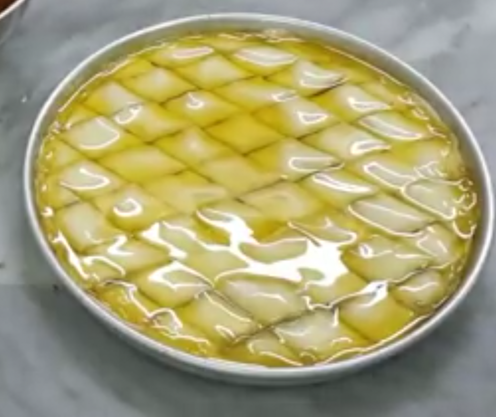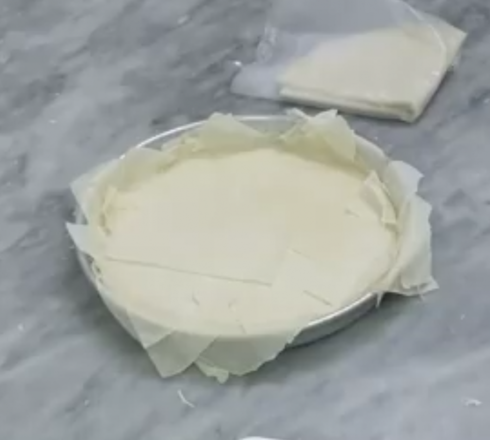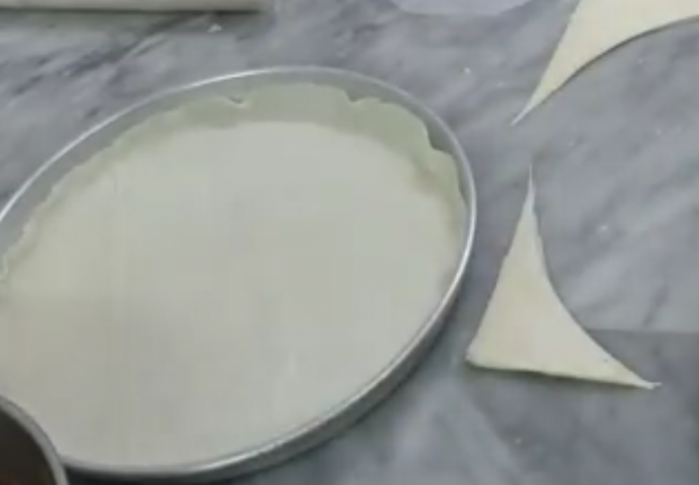 الآن أقوم بوضع الصينية فوق رقاقات العجين وقص الدائرة
