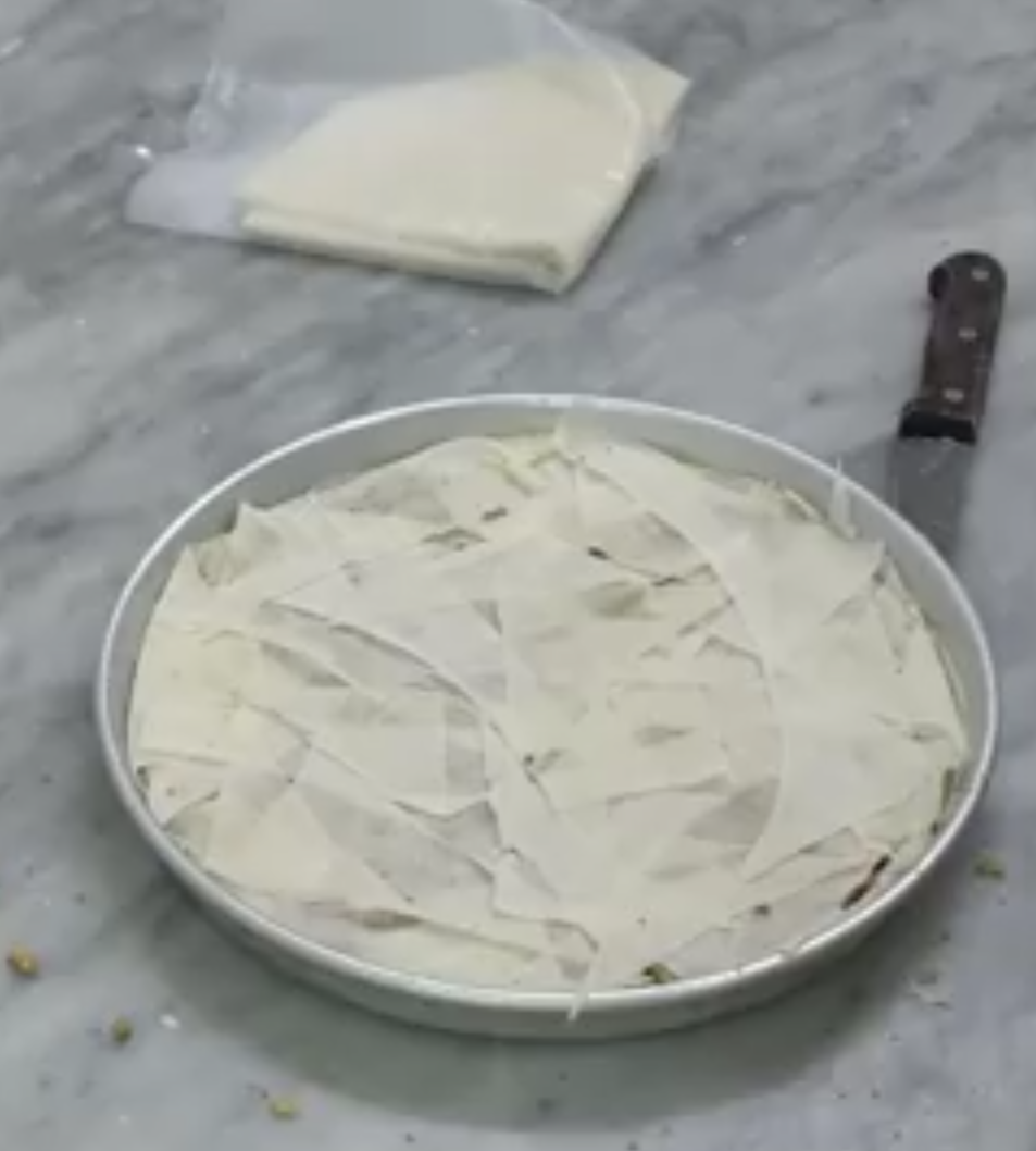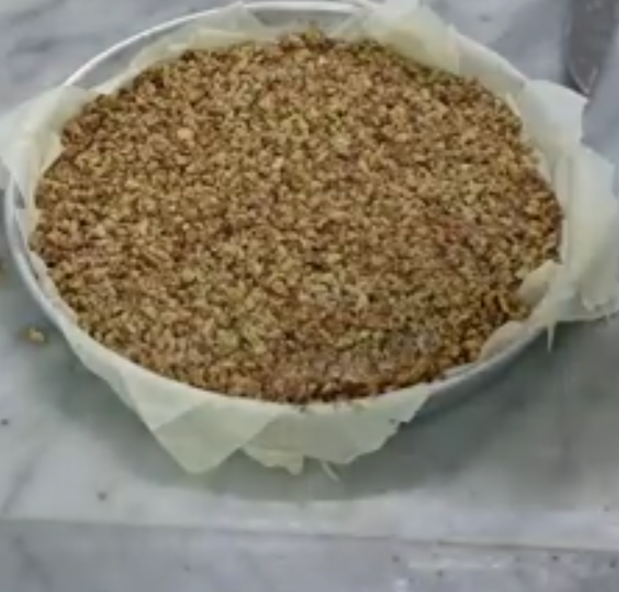 الآن ادخل كل زوايا العجين بقلبها فوق المكسرات و أضع كل القصاصات الصغيرة الباقية كي لا ارمي أي عجين ..
