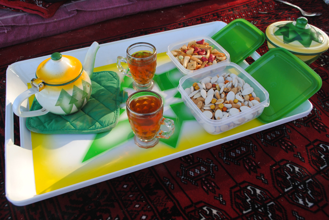 دله من العصر الحجري .. دافور صغير ومعها غاز ثاني احتياطي ( صغير على قدنا ) .. براد شاهي .. براد اصفر اعشقه .. طاستين .. وصحن .. الحين يبدأ الحسد والغيره امانه اذا بتروحون فرنسا تاخذون ذي الطاسه معكم ؟؟ حزنتوني
