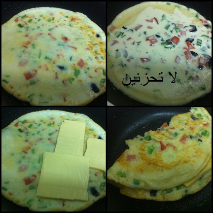 نحمي مقلاة لا تلتصق ونضع فيها زيت وكمية من الخلطة ونحرك المقلاة ليصبح شكل الخلطة دائري قرص ونحمرها ثم نقلبها على الوجه الاخر لنحمرها ونضع الجبن ورشة الاوريجانو ونثنيها بالنصف لتذوب الجبن ثم نشيلها من المقلاة