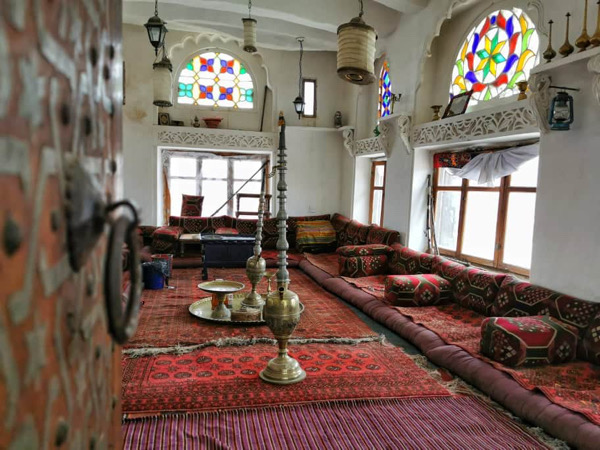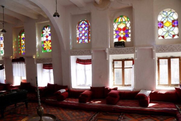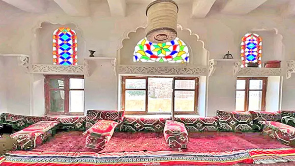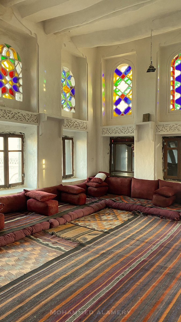 بيت مكون من خمسة طوابق من الطين كل طابق له اسم ويعلوة المجلس يقولوا علية المنظرة