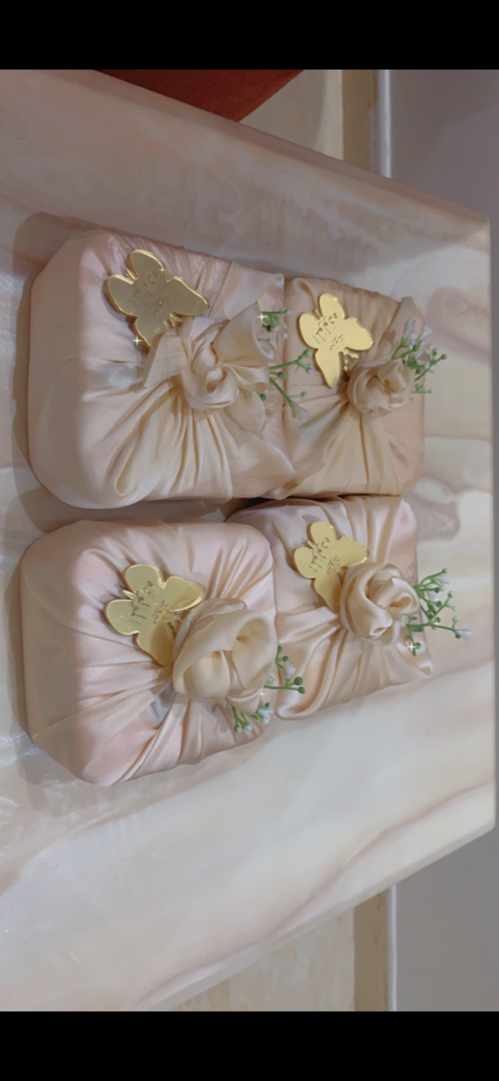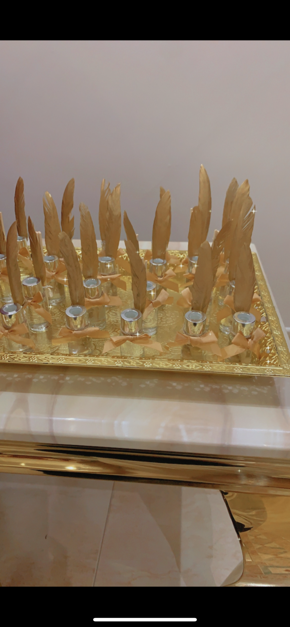 شنطة اكسسوارات صغيره و فواحات صغار وشريت مترين قماش ب 10 ريال وغلفت فيه العلب بطريقة التغليف الياباني و الفواحات اخذت من نفس المحل ريش ذهبي و حبال وزينتها فيها