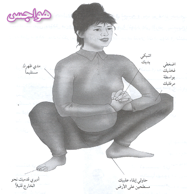 جلسة القرفصاء اعرف انها كويسة وقت الولادة فسويها وقت ضيق التنفس وان شالله وقت الولادة اعمليها + لو تبي تاخدي شي من الارض.