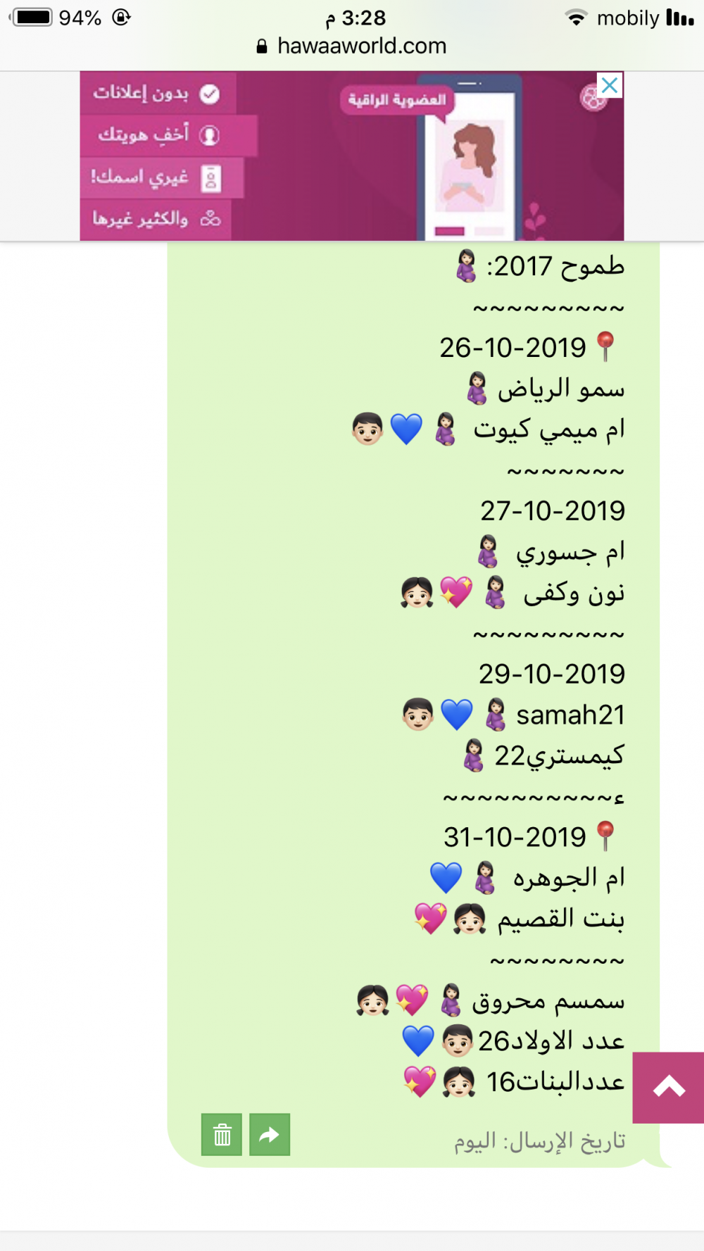 هاي الجديدة الي انتي بعثتيلياه شوفي حته التاريخ نسخته 🙄 مواليد سبتمبر 📍1-9-2019 تشيز كيك🤰🏻 ~~~~~~~~~~ 📍3-9-2019 Maaz123🤰🏻💖👧🏻 ~~~~~~~~~ 📍5-9-2019 ~~~~~~~~~~~ 📍6-9-2019 ~~~~~~~~~~ 📍7-9-2019 سمو الاميره البندري🤰🏻👦🏻💙 طالبه تايهة🤰🏻💙👦🏻 دنيتي اولادي:🤰🏻💖👧🏻👧🏻 ريتاج 343🤰🏻💖👧🏻 ~~~~~~~~~~ 📍8-9-2019 ~~~~~~~~~~ 📍11-9-2019 Aseeelaaa👦🏻💙🤰🏻 ~~~~~~~~~~ 📍14-9-2019 ~~~~~~~~~~ 📍15-9-2019 عضوية فنانه🤰🏻 Loush🤰🏻💖👧🏻 ~~~~~~~~~~ 16-9-2019 اسرار انثى 🤰🏻💙👦🏻 ~~~~~~~~~ 📍17-9-2019 احلى كورية🤰🏻💙👶🏻 1996Bayann🤰🏻💙👦🏻 ~~~~~~~~~~ 📍19-9-2019 om_rawad🤰🏻💙👶🏻 ~~~~~~~~~~ 📍20-9-2019 المها11🦋🤰🏻💙👦🏻 ريمانه$:🤰🏻💙👦🏻 ~~~~~~~~~~~ 📍23-9-2019 نافذه حزينه !🤰🏻 الامل المنتظر 1424🤰🏻💙👦🏻 Soz94🤰🏻💙👦🏻 Omamaar11🤰🏻 ~~~~~~~~~~~ 📍25-9-2019 Om saleem🤰🏻 ~~~~~~~~~~~ 📍26-9-2019 Hebak95🤰🏻👦🏻💙 ~~~~~~~~~~~ 📍27-9-2019 &&دلوعة عبودي&&🤰🏻💙👦🏻 ~~~~~~~~~~ 📍28-9-2019 عطرإمرأه🤰🏻💙👦🏻 nadaaaa2018🤰🏻💖👧🏻 ~~~~~~~~~~ 📍29-9-2019 التفائل11:🤰🏻💙👦🏻 ____________________ مواليد اكتوبر 📍1-10-2019 ورود الفرح🤰🏻 ~~~~~~~~~ 2-10-2019 ~~~~~~~~~ 📍3-10-2019 قشطة بالمكسرات 🤰🏻💖🤰🏻 بنت الزهراني🤰🏻 mayada1988 🤰🏻💖👧🏻 ام فهد -2019🤰🏻💙👦🏻 ~~~~~~~~~~~ 📍4-10-2019 ~~~~~~~~~ 📍5-10-2019 msmhsa2019🤰🏻💙👦🏻 وين ألقاك؟🤰🏻 ~~~~~~~~~~ 📍6-10-2019 um-maryoom🤰🏻💖👧🏻 ~~~~~~~~~~ 📍7-10-2019 ام..موووودي🤰🏻💖👧🏻 ام العنود ولولو🤰🏻💖👧🏻 ~~~~~~~~~~~~ 📍10-10-2019 الحلا انا 🤰🏻 ~~~~~~~~~~ 📍12-10-2019 انثى لاتنسى:🤰🏻💙👦🏻 ~~~~~~~~~ 📍13-10-2019 raindropss 🤰🏻💖👧🏻 ام سعود83🤰🏻💙👦🏻 ~~~~~~~~~~~~ 📍14-10-2019 ~~~~~~~~~~ 📍15-10-2019 ~~~~~~~~~~~ 📍16-10-2109 نسيم بغداد0000🤰🏻💙👦🏻 الديم🌨:🤰🏻💖👧🏻 ~~~~~~~~~ 📍17-10-2019 ~~~~~~~~~~~ 📍20-10-2019 دريم ويب 🤰🏻 لحظه للتذكر :🤰🏻💙👦🏻 ~~~~>~~~~ 📍21-10-2019 ام طه*🤰🏻💙👦🏻 ~~~~~~~~ 📍22-10-2019 الريم 💕🤰🏻💙👦🏻 ~~~~~~~~~~ 📍23-10-2019 ام مالك30 🤰🏻 ~~~~~~~~~ 📍25-10-2019 طموح 2017:🤰🏻 ~~~~~~~~~ 📍26-10-2019 سمو الرياض🤰🏻 ~~~~~~~ 27-10-2019 ام جسوري 🤰🏻 نون وكفى 🤰🏻💖👧🏻 ~~~~~~~~~ 29-10-2019 samah21🤰🏻💙👦🏻 كيمستري22🤰🏻 ء~~~~~~~~~~ 📍31-10-2019 ام الجوهره 🤰🏻💙 بنت القصيم 👧🏻💖 ~~~~~~~~ سمسم محروق🤰🏻💖👧🏻 عدد الاولاد25👦🏻💙 عددالبنات16 👧🏻💖 تاريخ الإرسال: 24-06-2019هاي الجديدة الي انتي بعثتيلياه شوفي حته التاريخ نسخته 🙄 مواليد سبتمبر 📍1-9-2019 تشيز...