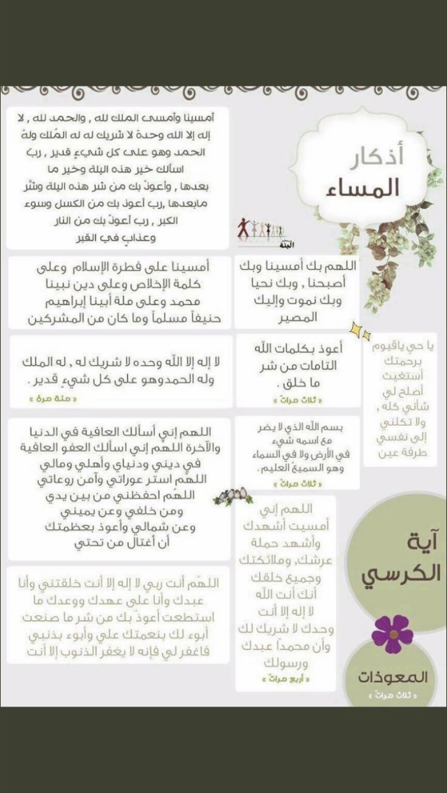 (أَمْسَيْنَا وَأَمْسَى الْمُلْكُ لِله وَالْحَمْدُ لِلَّهِ لاَ إِلَهَ إِلاَّ اللَّهُ وَحْدَهُ لاَشَرِيكَ لَهُ) صحيح مسلم ، أذكارالمساء