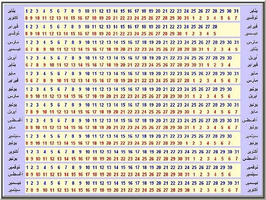 شوفو هذا الجدول اختارو يوم اخردورة من اللون الازرق وتحته مباشرة يوم ولادتك باللون الاحمر