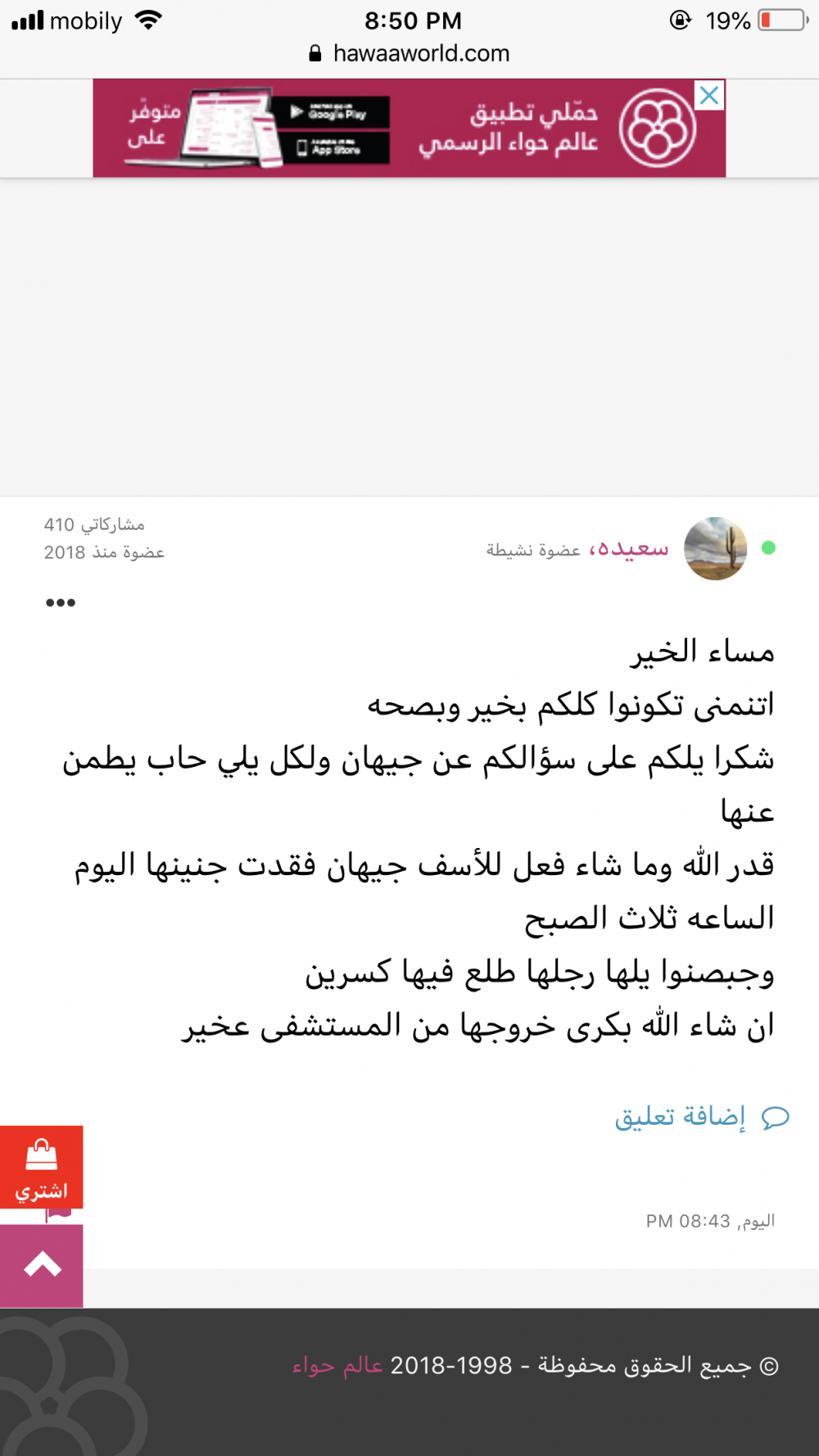 الحمدلله على ماكتب وقدّر .. ربي يقومها بالف سلامه .. ويعوضها ربي العوض الجميل 🙏🏻