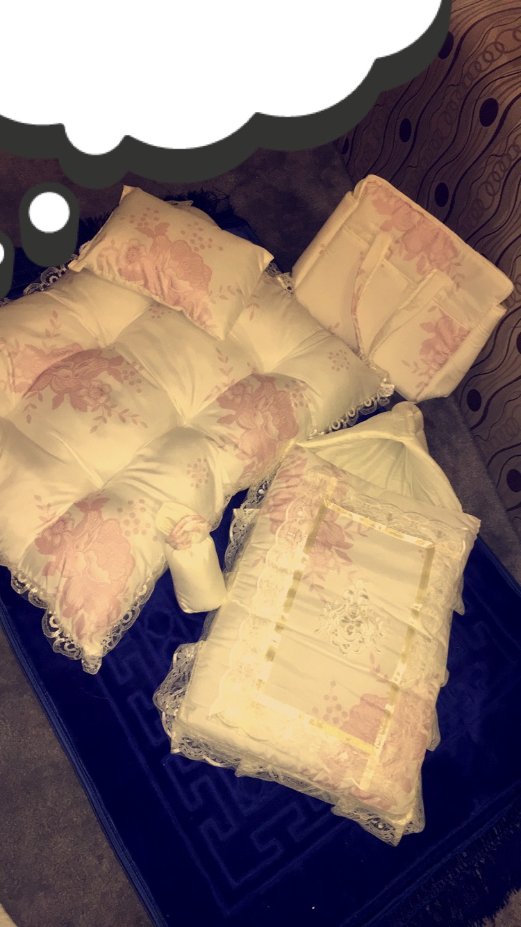 هذا الطقم الي حكيتكم عنه عباره عن اسفنجه مقاسها وسط ومخده وشنطه حجمها مررره اعجبني وبيت الطفل وتلبيسة رضاعه