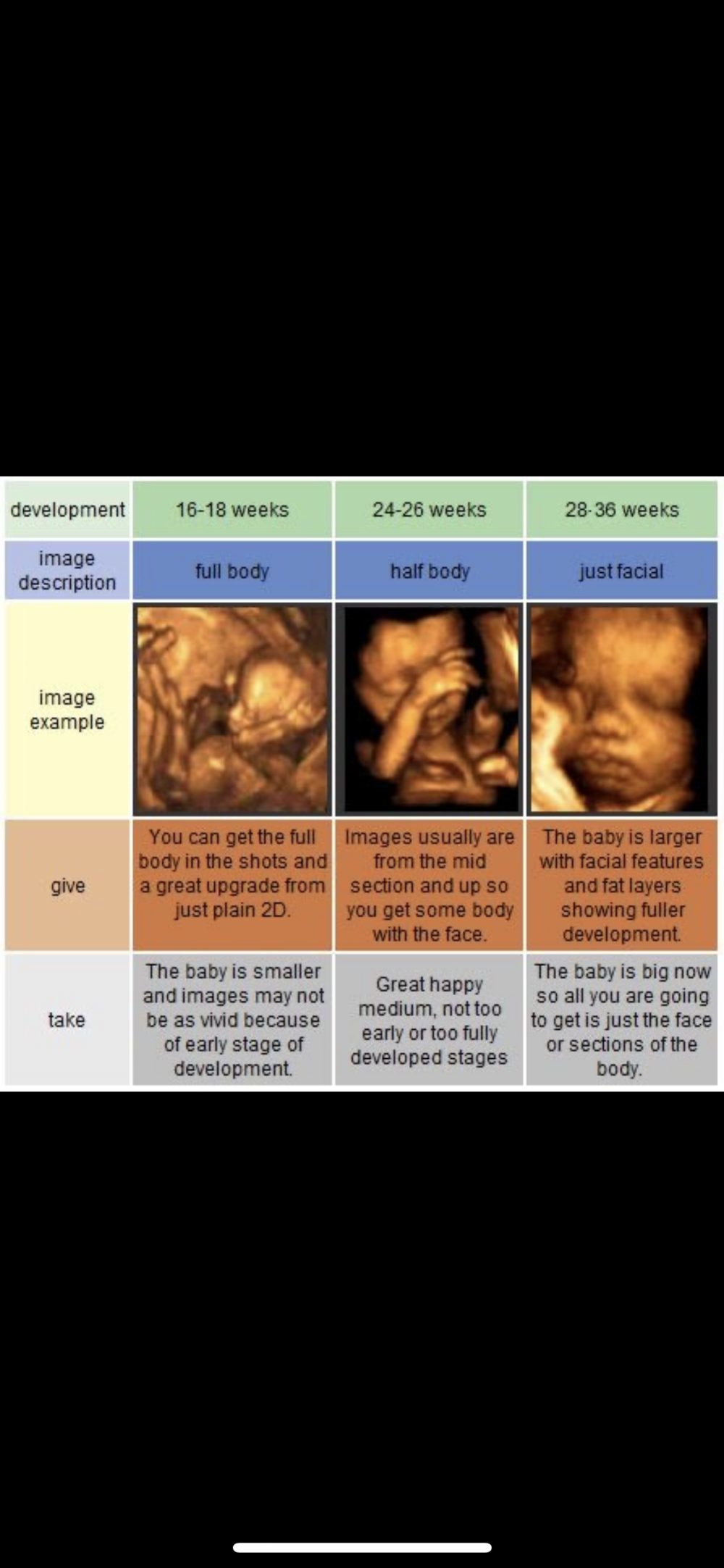 من ٢٤-٢٦ اسبوع هو التوقيت الافضل للسونار الرباعي وراح يظهر لك تفاصيل الجنين بشكل واضح من الوجه واجزاء من الجسم