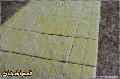 بعد ذلك رقيها على الرخام وقطعيها على مقاس الصينيه التي ستدخل الفرن