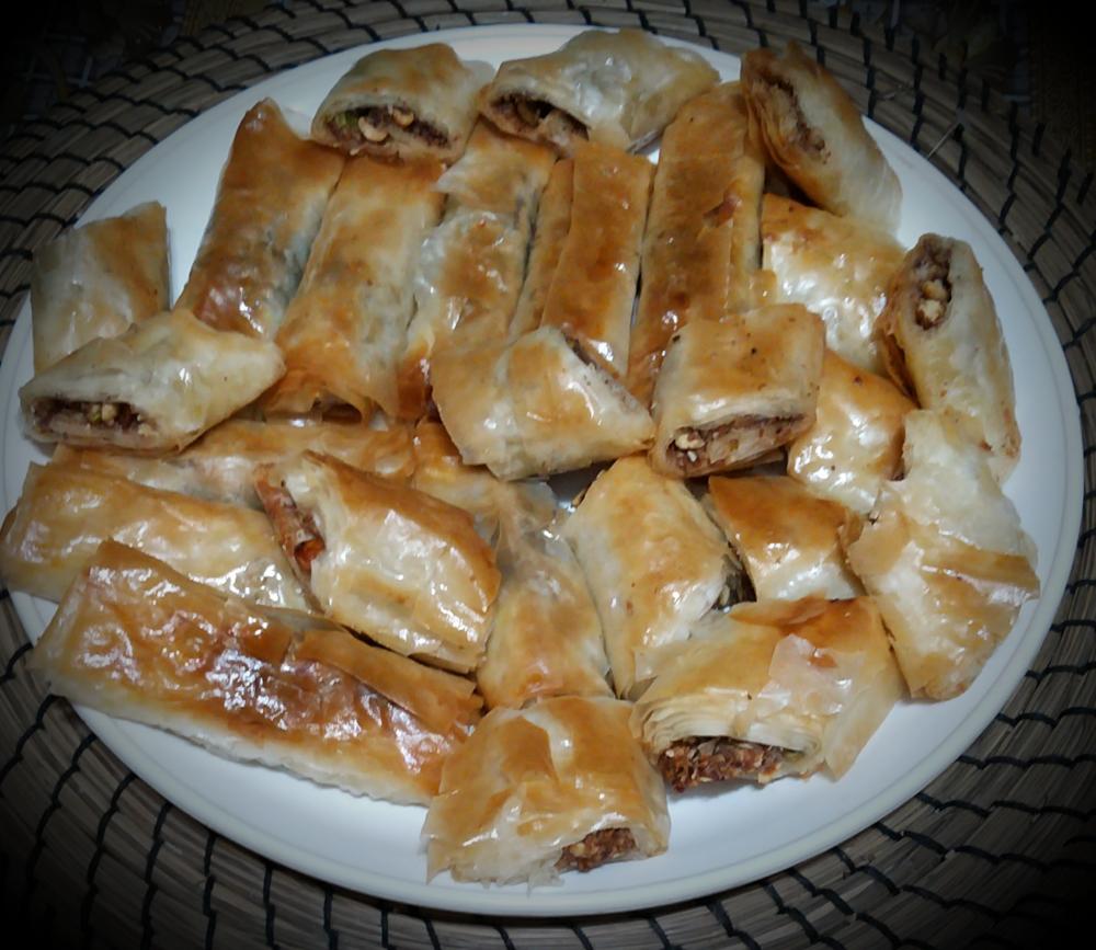 نمسك الورقة الواحدة ونقطعها بالسكين اربع عواميد ثم نضع واحدة بالطول وواحدة عليها بالعرض ( مثل الصليب ) ثم ندهنها بالسمن طولا وعرضا ثم نضع في النصف الحشو ونطوي طرفي الورقة الي بالعرض على الحشو ثم نلفها اصبع بالطول ( وهذه هي طريقتي المفضلة )