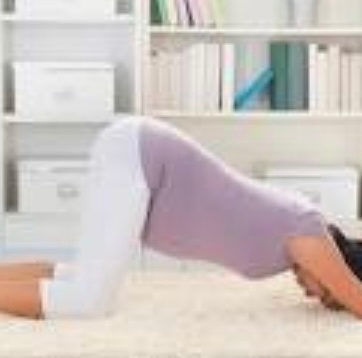 اركعي على بساط على الأرض، مع وضع الرأس والكتفين على الأرض والمؤخرة لأعلى، وابقاء الركبتين متباعدتين، من دون الضغط على البطن من خلال الفخذين، والهدف من هذا التمرين هو إمالة الطفل إلى الخلف وإخراجه من الحوض واعطاءه مساحة أكبر للالتفاف.