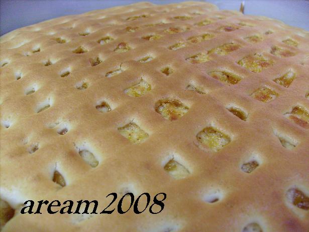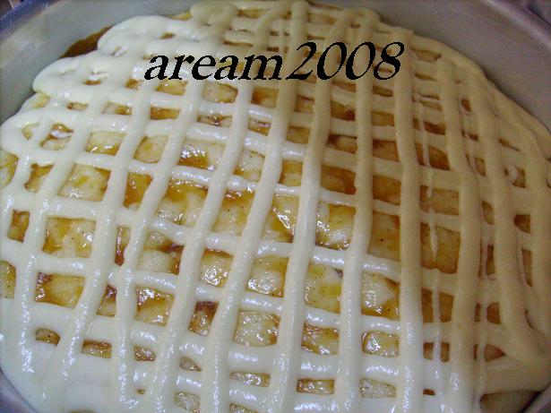 ثم نخلط مقادير الوجه ((((( المربى واللي معه )))) ونضعها في كيس ونعصرها على الوجه الى ان تغطيه ثم ندخله الفرن (( حطيته بالملعقة لأن خليط الكيك كان ثقيل شوي لأني ما كثرت الحليب وطلعت رهيبه
