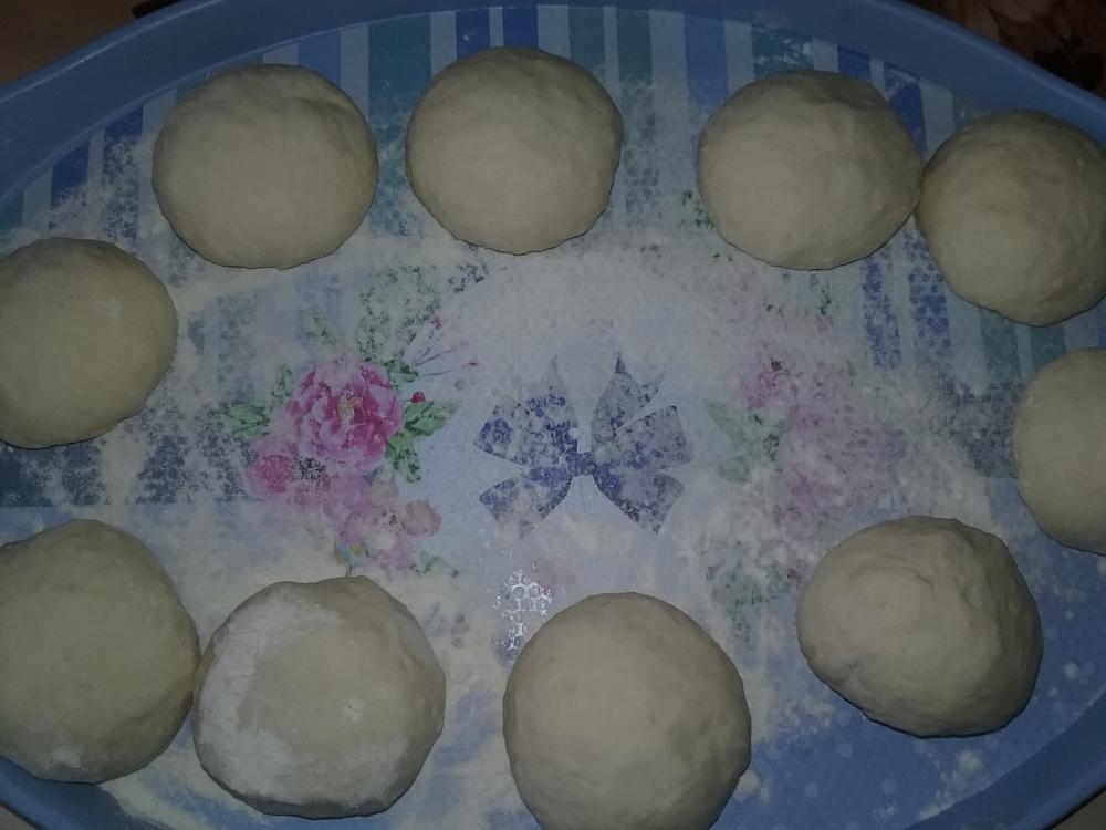خلطت المقادير الجافه الدقيق والخميره والملح ثم اضفت الماء بالتدريج الى ان تكونت عجينه لا تلتصق باليد وخليتها تخمر ساعة ثم كورتها الكمية جابت لي عشر كرات غطيت الكرات وخليتهم يخمروا نص ساعه ثم مديتهم على شكل دائري لاتخليها رقيقه