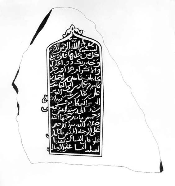 حجر عليه نقش صفوي كتب بخط غائر بطريقة النقر من اليسار إلى اليمين وبطريقة حلزونية -النص : ب ر أ ل ب ن ع د ي ب ن ت ح ل د م ب ن س ر أ هـ ع ق ص ع ر ع م ج و ر ب هـ ط و ل ت ع ش أ ث و ع د ق ب ر و د-القراءة : بر أل بن عدي بن طحلدم بن سرا هعقص عر عمج ورب هط ولتع شأث وعد قبر ود.(النقش لم يتم فك شفرة معانيه بعد)