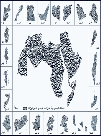رسمت الفنانة العراقية جنة عزت الآية القرآنية “واعتصموا بحبل الله جميعا” على شكل خارطة الوطن العربي وخصت كل قطر عربي بلوحة عبارة عن آية تحاكي حال البلد . # العراق : ” رب إني مسني الضر و أنت أرحم الراحمين “ لبنان : ” كأنها كوكب دريّ فلسطين : ” ربنا أفرغ علينا صبراً و ثبت أقدامنا و انصرنا على القوم الكافرين “ عمان : ” جنات عدن تجري من تحتها الأنهار خالدين فيها أبدا “السودان ” إن يمسسكم قرح فقد مس القوم قرح مثله و تلك الأيام نداولها بين الناس ” ..إلى آخر الآية جزر_القمر : ” الله لا إله إلا هو الحي القيوم الجزائر : ” و أشرقت الأرض بنور ربها و جيء بالنبيين و الشهداء ” .. إلى آخر الآية الصومال : ” يسقون من رحيق مختوم “ البحرين : ” يخرج منهما اللؤلؤ و المرجان “ تونس : “و زيتونا و نخلا و فاكهة ” الى آخر الآية الأردن : ” ربنا آتنا من لدنك رحمة و هيء لنا من أمرنا رشدا. المغرب : ” رب المشرق و المغرب و ما بينهما إن كنتم تعقلون “ مصر : ” و أوحينا إلى موسى و أخيه أن تبوءا لقومكما بمصر بيوتا ” إلى آخر الآية الإمارات : ”سورة الفاتحة “ ليبيا : ” و لا يؤوده حفظهما “ سوريا : ” و جزاهم بما صبروا جنة وحريرا .. الكويت : ” و نزعنا ما في صدورهم من غل إخوانا على سرر متقابلين “ جيبوتي : ” جزاؤهم عند ربهم جنات عدن “ موريتانيا : ” إنا نحن نزلنا الذكر و إنا له لحافظون “ اليمن : ” لقد كان لسبأ في مسكنهم آية ” .. إلى آخر الآية السعودية : ”و طهر بيتي للطائفين والعاكفين والركع السجود ”رسمت الفنانة العراقية جنة عزت الآية القرآنية “واعتصموا بحبل الله جميعا” على شكل خارطة الوطن...