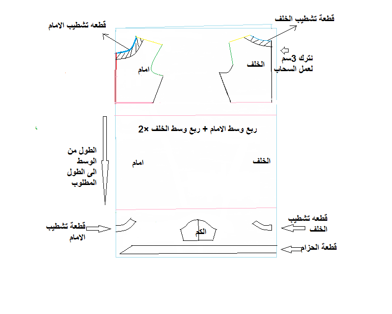 هنا ما قصينا قطعه تشطيب للرقبه لان بنشطبها بالبيييه وهو شريط عرضه 3سم مقصوص ورب اما نقصة من القماش او نستخم الجاهز