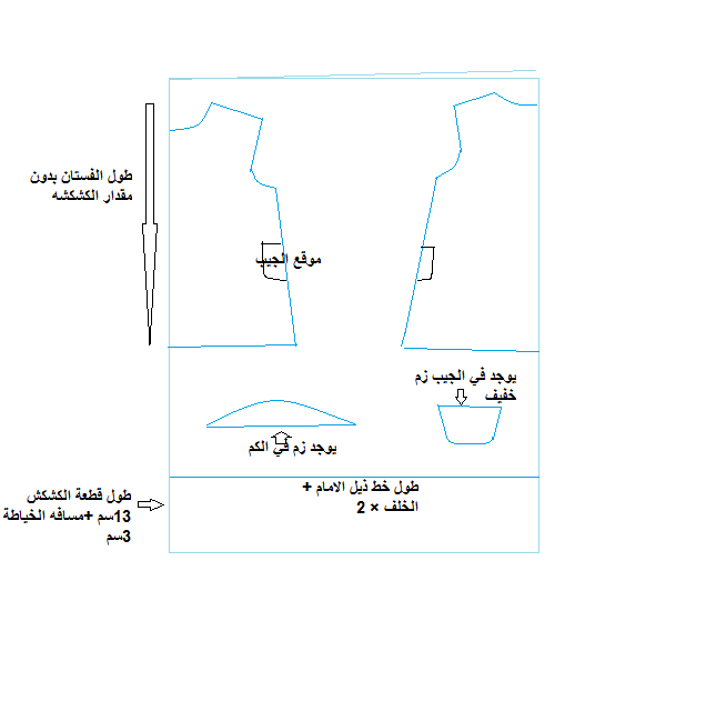 نرسم باترون الامام والخلف بدون عمل تقسيم للوسط وطول الفستان بدون كشكشه يعني ادا طول الفستان 50 بطرح مقدار الكشكشه وهي 13 وهي مقدار الكشكش بيصير 50-13= 37سم
