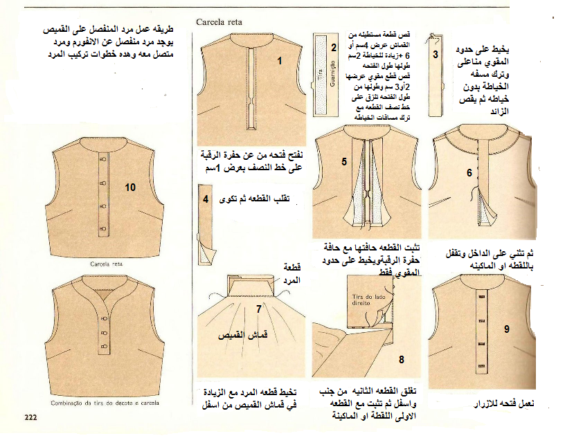 بعد قص القطع كلها بنقص قطع التشطيب بوضع الامام او الخلف بعدالقص على القماش مرة ثانية الامام على مثني والخلف على مفتوح ونقص على حدود حردة الرقبه ونصف الكتف ثم نرفع القطعه ونقص على بعد 5سم حول الرقبه وتعطينا قطعه التشطيب وتسمى (السجاف أو الانفورم)