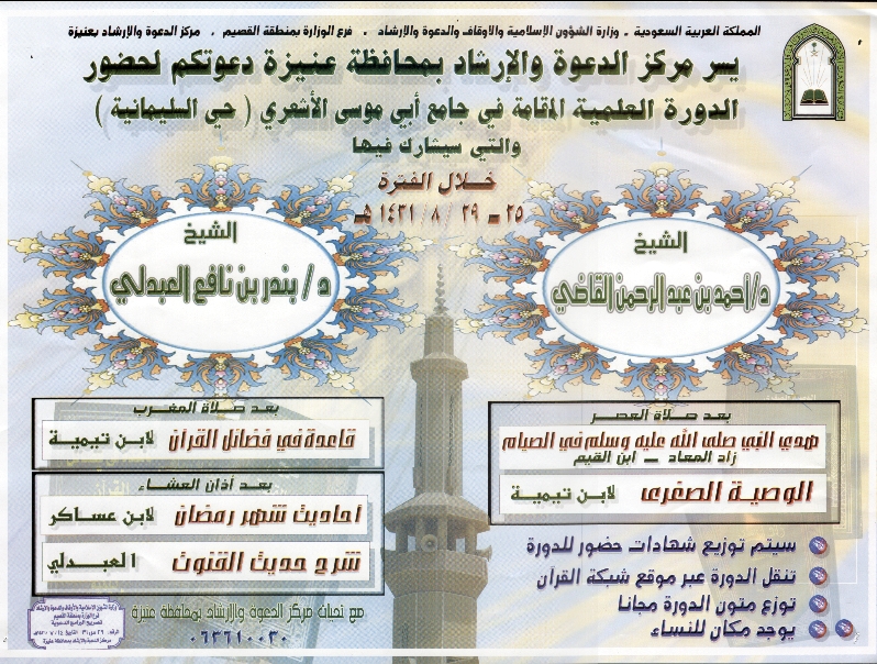 جديد الشبكة ابتداء من يوم الجمعة بحول الله مباشرة الدورة العلمية في جامع السليمانية بعنيزة