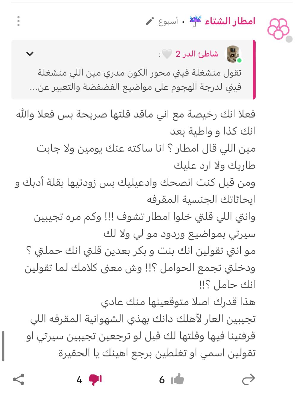 بالعكس والله نقاشك انتي وامطار حلو عقليات راقيه ومتحدثات لبقاتبالعكس والله نقاشك انتي وامطار حلو عقليات راقيه ومتحدثات لبقات