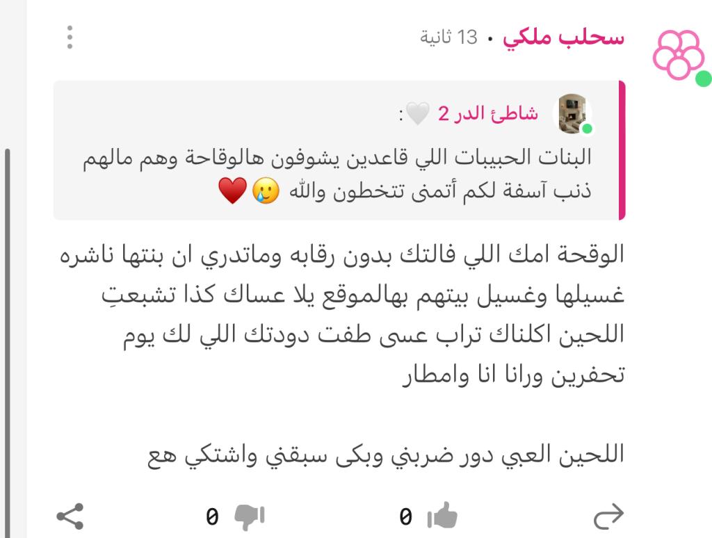 ١- انتِ شلون حاظرتني وتشوفين كلامي ٢- اللي تتجرأ تسب امهات الناس بالموقع فأكيد متعودة بالواقع تسبسب واهلها ساكتين + مربية عيالها على هالوقاحة 👍 خلاص صرتِ شيبة عيب احشمي شيبك١- انتِ شلون حاظرتني وتشوفين كلامي ٢- اللي تتجرأ تسب امهات الناس بالموقع فأكيد متعودة بالواقع...