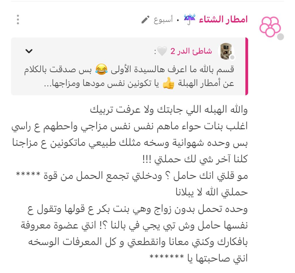 محامية عواطف، تشوفين من زاوية وحدة انصفي🔴 تقولين عني غلطانة عليهم واذا جيت فتحت الموضوع ووريتكم كلامهم وسبب التعدي تقولون سكري السيرة ؟؟!!! انتِ تبررين لهم كله تنتقديني بس هم تقولين متزوجات يشوفون شيء ماتشوفينه