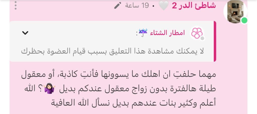 محامية عواطف، تشوفين من زاوية وحدة انصفي🔴 تقولين عني غلطانة عليهم واذا جيت فتحت الموضوع ووريتكم كلامهم وسبب التعدي تقولون سكري السيرة ؟؟!!! انتِ تبررين لهم كله تنتقديني بس هم تقولين متزوجات يشوفون شيء ماتشوفينهمحامية عواطف، تشوفين من زاوية وحدة انصفي🔴 تقولين عني غلطانة عليهم واذا جيت فتحت الموضوع ووريتكم...