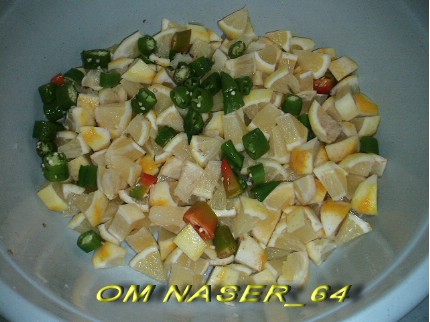 ونجهز الخلطة وهي عبارة عن ليمون مفروم مع قشره ونزيل البذور وفلفل اخضر حسب الرغبة ( يعني لو حبتيه حار كثري بس ما انصح بتكثير الفلفل